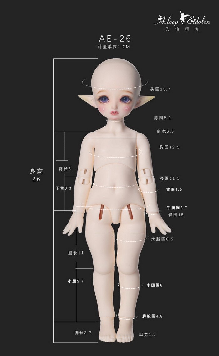 ![]() The body comes with hands A by default, other hands type costs USD20/pair (+$10 if with blushing), you can use this USD1 page to add them. Measurements: -Height: 26cm (when with head) -Neck: 5.1cm -Shoulder Width: 6.5cm -Arm Length: 8cm -Chest: 12.5cm -Waist: 11.5cm -Hips: 15cm -Thighs: 8.5cm -Leg Length: 11cm -Foot Width: 1.7cm -Foot Length: 3.7cm