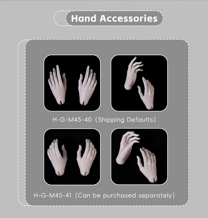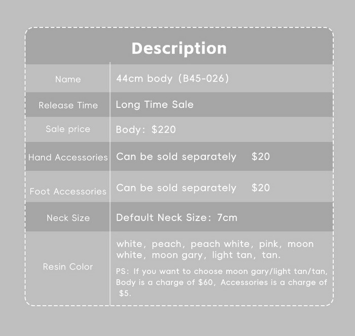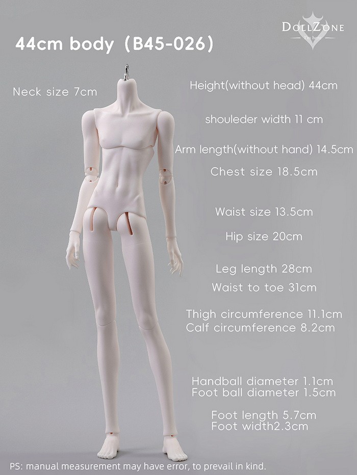 Doll Zone New Body Promotion (2026.01.29 - 2026.04.10): 15% off.* And can order a pair of normal hands at $8 (moon grey/light tan/tan +$5), please see them in below pictures. You can use this USD1 page to add them. ====================================================================== Includes: 1 nude body (the head in the pictures is not included) ![]() * Default feet are flat feet, default hands are H-G-M45-40. * Other feet/hands types cost $20/pair (moon grey/light tan/tan +$5), please see them in below pictures. You can use this USD1 page to add them. Measurements: Height (Including head): 48cm Height (without head): 44cm Neck size: 7cm Shoulder width: 11cm Arm length: 14.5cm Chest Size: 18.5cm Waist Size: 13.5cm Hip Size: 20cm Leg Length: 28cm From waist to toe: 31cm Thigh Width: 11.1cm Calf Width: 8.2cm Foot Length: 5.7cm Foot Width: 2.3cm