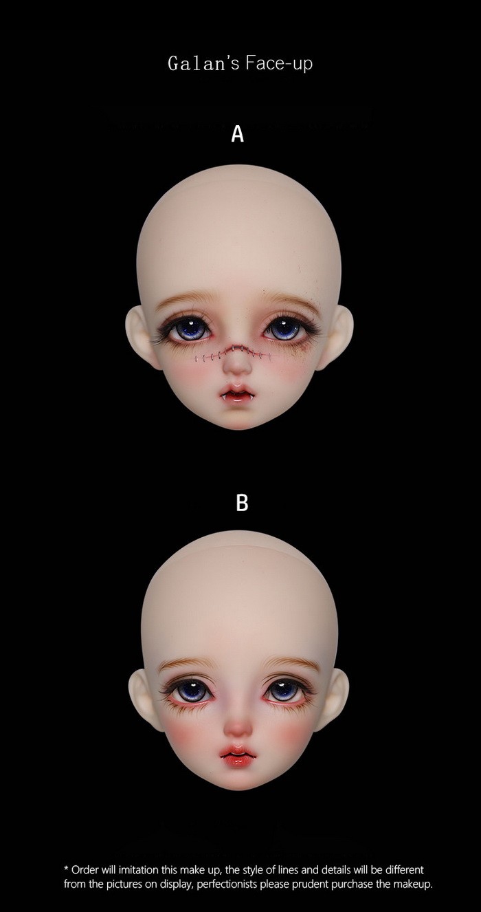 Galan, 41cm Asleep Eidolon Girl. ![]() Basic Price Includes: -Basic Doll -Eyes (random) -Birth Card -Packaging Measurements: -Eyes: 14mm -Height: 41cm -Head: 18cm -Neck: 6.3cm -Shoulder Width: 8.8cm -Arm Length: 11.9cm -Chest: large-17.5cm, small-16.8cm -Waist: 13.6cm -Hips: 20.5cm -Thighs: 12cm -Leg Length: 21.2cm -Foot Width: 2.2cm -Foot Length: 5.6cm