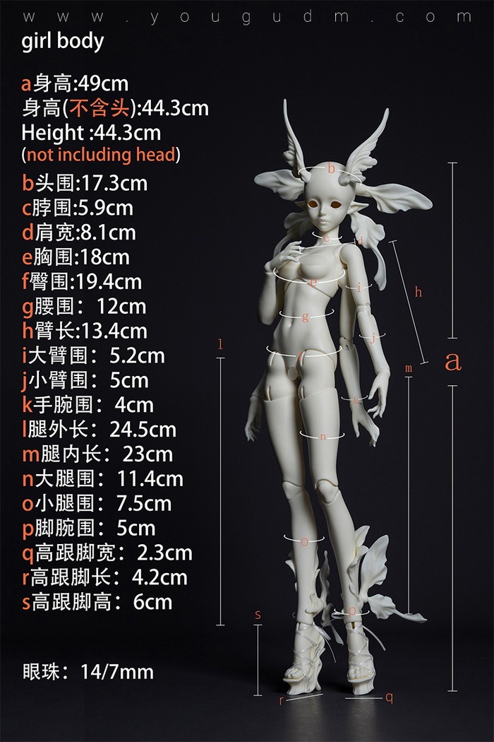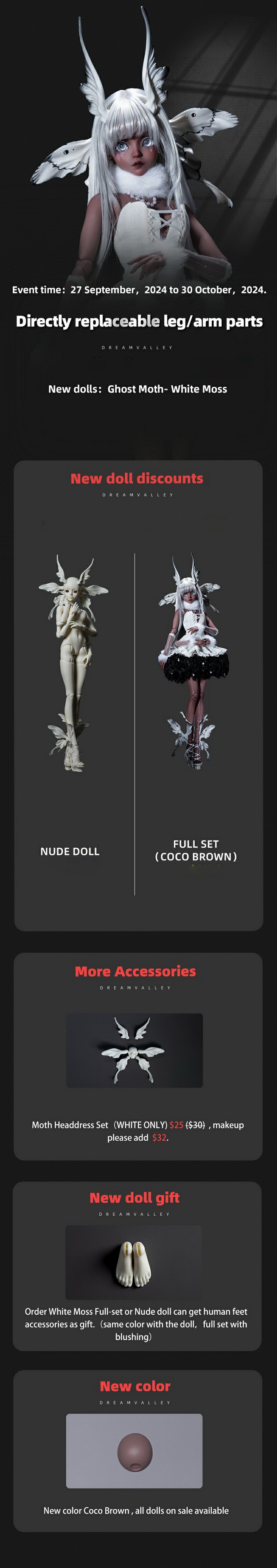 * Basic doll including: white moss head, B4-30 moth body (high heeled feet), moth headdress set, moth high heeled shoes set (including white ribbon), shoulder replacement single arm inserts.