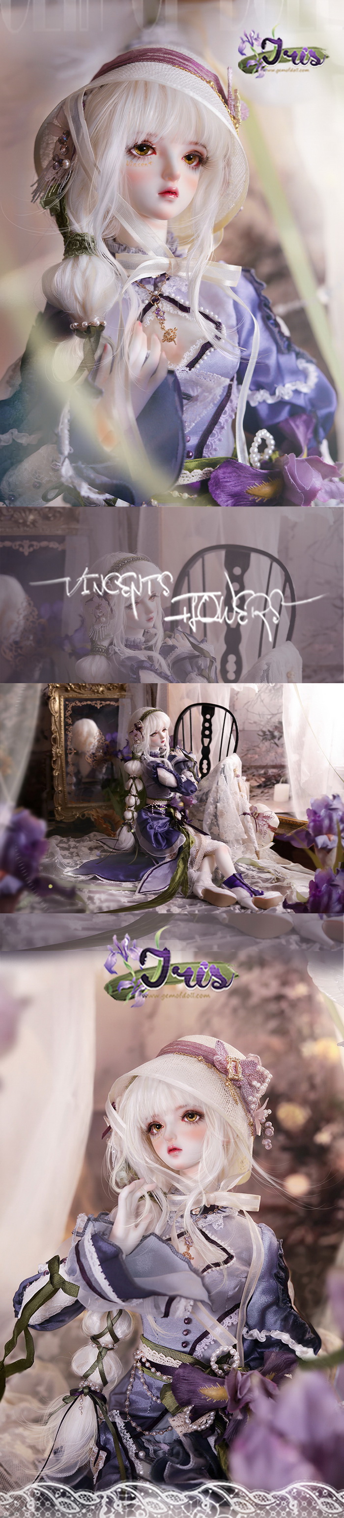Iris, 58cm Gem of Doll Limited Girl (70 sets limited). ![]() Basic Price Includes: *Basic Doll *Eyes (Random Color) *Pillows *Birth and membership card (Fullset + Body Blush) Includes: *Basic set *Face-up *Body blush *Clothes(hat & headdress included) *Wig *Shoes Notes: Skin color in pictures is white skin. Clothes limited 30 sets. Face-up & body blush are included in Fullset price, so if you've chosen Fullset please choose face-up & body blush as 'no'. Measurements: - Eyes : 14mm - Height: 58cm - Head Circumference: 22cm - Neck Circumference: 8.2cm - Shoulder Width: 12.4cm - Arm Length (without hand): 16.5cm - Chest: Small-23.2cm, Medium(normal)-24.2cm, Large-25cm - Waist: 15.7cm - Hips: 25.5cm - Thigh Circumference: 14.5cm - Calf Circumference: 8.9cm - Leg Length (waist to foot): 34.5cm - Foot Length: 7cm - Foot Width: 2.7cm