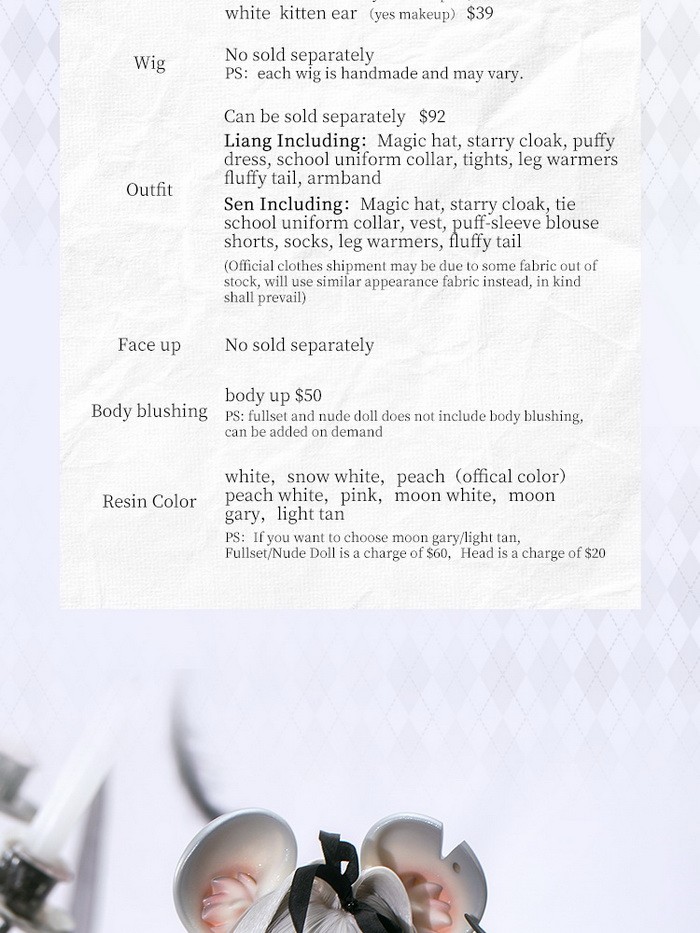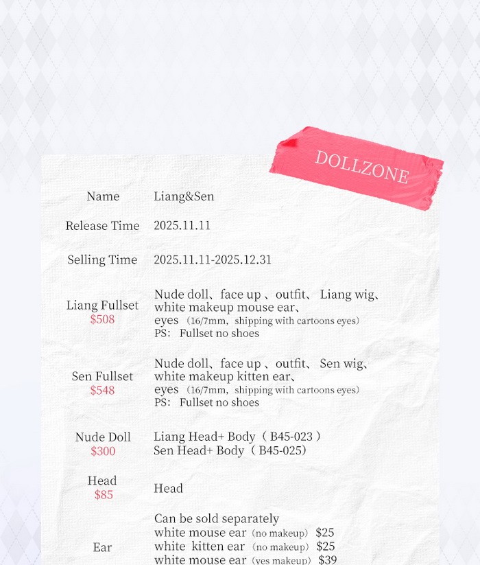Doll Zone New Doll Promotion (2025.11.11 - 2025.12.31): * 15% off. * And can order a nude Sen head at $64 (moon grey/light tan +$20), you can use this USD1 page to add it. ====================================================================== Liang, 47cm Doll Zone Girl ![]() Basic Price Includes: -Basic Doll (not including special ears) -Eyes (random cartoon eyes) -Birth Card -Packaging Notes: * Doll in pictures is in peach skin. * Clothes & special ears are limited (discontinue after 2025.12.31). * Special Parts A means the mouse ears (white resin), Special Parts B means the kitten ears (white resin). Measurements: Eyes : 16mm Height: 47cm Head size: 17.5cm Neck size: 6.8cm Shoulder width: 10.2cm Arm length (without hand): 13.8cm Chest size: A-18.8cm, B-20cm, C-21cm, D-21.6cm Waist size: 13.3cm Hip size: 20.8cm Waist to toe: 27.7cm Leg length (with feet): 26.8cm Thigh girth: 11.8cm Calf girth: 8cm Foot size(flat feet): 5.7*2.1cm