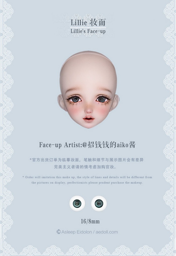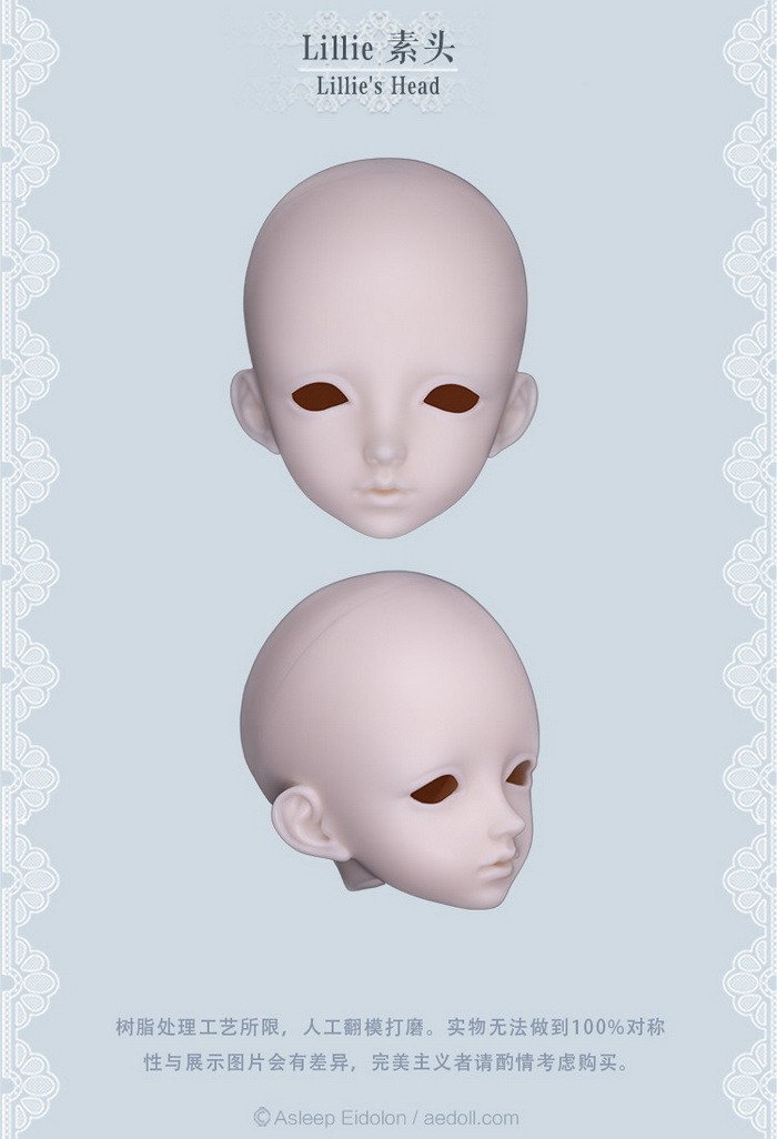 Lillie, 59cm Asleep Eidolon Girl. ![]() Basic Price Includes: -Basic Doll -Eyes (random) -Birth Card -Packaging Measurements: -Height: 59cm -Head: 21.5cm -Eyes: 16mm -Neck: 8.3cm -Shoulder Width: 10.5cm -Arm Length: 16.3cm -Chest: 23cm -Waist: 18cm -Hips: 24.3cm -Thighs: 15.3cm -Leg Length: 30.5cm -Foot Width: 2.8cm -Foot Length: 7.1cm