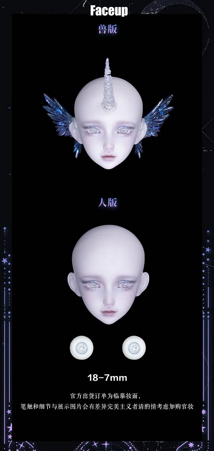 Lyra, 62cm Asleep Eidolon Limited Girl (2026.02.08 - 2026.04.08). ![]() Basic Price Includes: -Basic Doll -Eyes (random) -Birth Card -Packaging Fullset Includes: Basic doll, faceup, official eyes, clothes, wig, birth card, packaging. * Please choose faceup option as 'no' if you choose fullset which includes faceup already. Notes: * The doll in pictures is in peony white skin with normal waist, wide shoulders, chest B. * The doll is with normal legs & feet, not heel legs/feet. * No narrow shoulder option for Chest C, so please don't choose narrow shoulder with chest C. More Options (only addable with doll): Special Ears: USD36 (nude if ordering nude doll, painted if ordering fullset doll) Gloved Hands: USD96 Wings (made of cotton): USD76 Human Head: USD130 (+$60 if with faceup) Special Head: USD150 (+$60 if with faceup) You can use this USD1 page to add these items/services. Measurements: -Height: 62cm -Head: 21.5cm -Eyes: 18mm -Neck: 8.8cm -Shoulder Width: Narrow-12.1cm, Wide-13.2cm -Chest: A-26.3cm, B-27cm, C(not fit for narrow shoulder)-28.5cm -Waist: 17.5cm -Hips: 29.5cm -Arm Length: 18.5cm -Arm Circumference: 7cm -Wrist Circumference: 4.8cm -Leg Length: 33cm -Thigh Circumference: 16.8cm -Calf Circumference: 10.7cm -Ankle Circumference: 7.4cm -Foot: 7.1*2.5cm