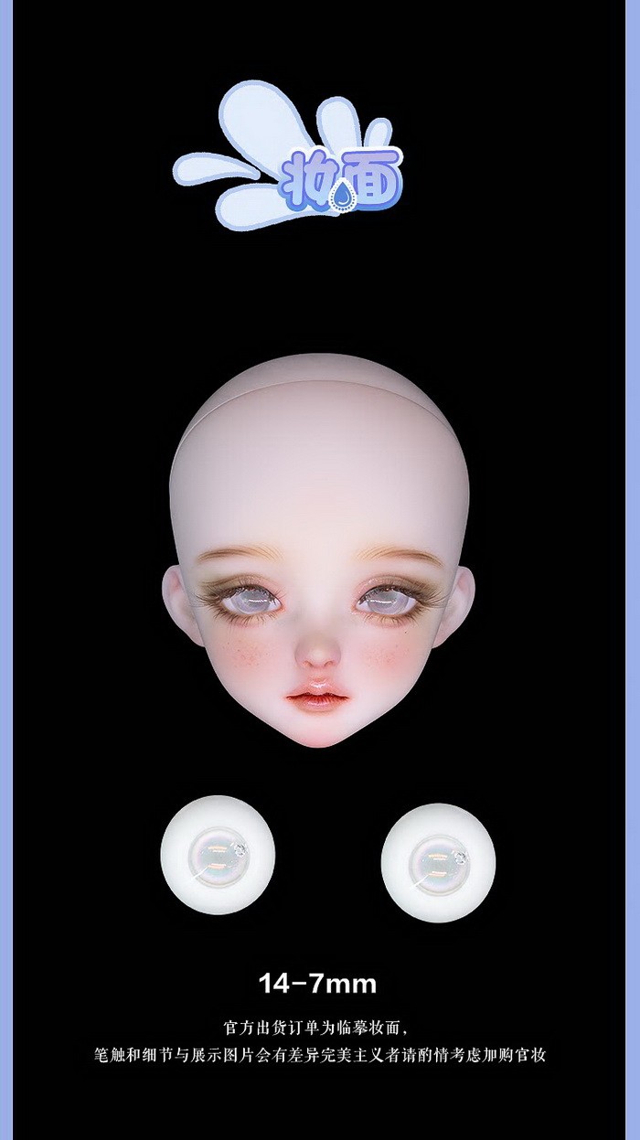 Momo, 42.6cm Asleep Eidolon Girl. ![]() Basic Price Includes: -Basic Doll -Eyes (random) -Birth Card -Packaging Measurements: -Eyes: 14mm -Height: 42.6cm -Head: 18cm -Neck: 6.5cm -Shoulder Width: 9cm -Arm Length: 13.3cm -Chest: large-19.4cm, small-18.4cm -Waist: 14.1cm -Hips: 21.6cm -Thighs: 13.5cm -Leg Length: 22.3cm -Foot Width: 2cm -Foot Length: 5.3cm
