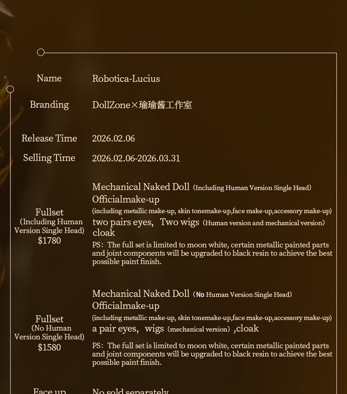 Robotica-Lucius Mechanical Ver. (Fullset), 77cm Doll Zone Limited Special Doll (60 sets limited, discontinue after 2026.03.31).