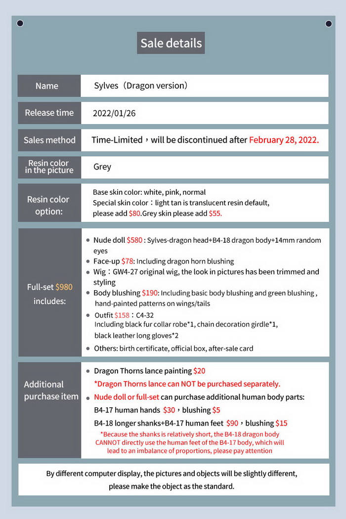 Sylves Dragon Ver. (white, nude, in stock) - 48cm Dream Valley Limited Doll. ![]() Includes: - Basic Doll (with horns) - Eyes(Random Color) - Package Box - Certificate Measurements: Height: 48.5cm Eyes: 14mm Head size: 17cm neck circumference 6.7cm shoulder width 10cm chest circumference 19cm waistline 13.5cm hipline 18.5cm arm length 14.7cm leg length(outer) 28cm leg length(inner) 26.3cm thigh circumference 11.2cm calf circumference 8cm tail length: 48cm