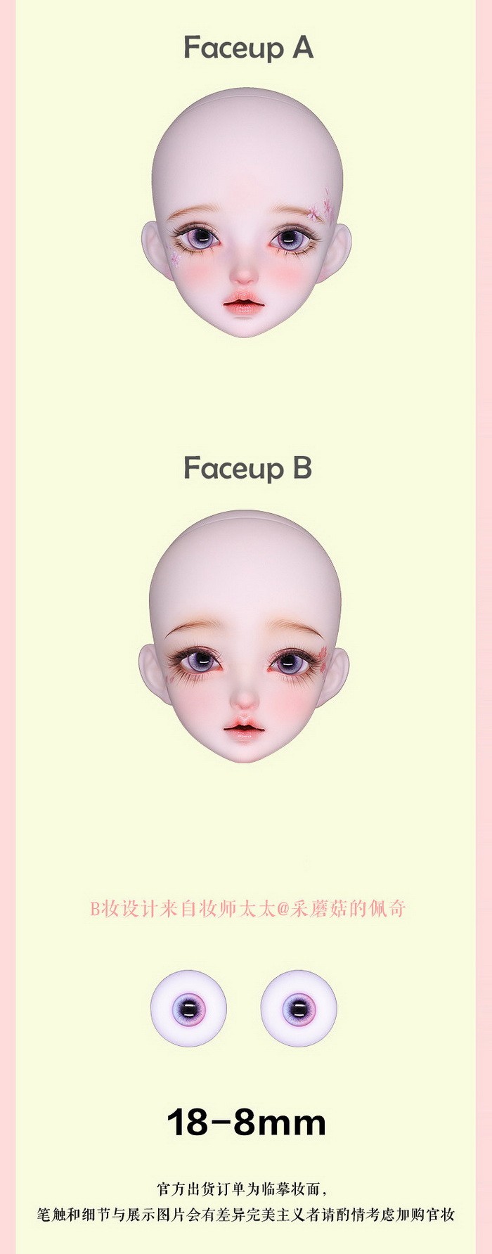 Ying Jian, 59cm Asleep Eidolon Girl. ![]() Basic Price Includes: -Basic Doll -Eyes (random) -Birth Card -Packaging Measurements: -Height: 59cm -Head: 21.5cm -Eyes: 18mm -Neck: 8.3cm -Shoulder Width: 10.5cm -Arm Length: 16.3cm -Chest: 23cm -Waist: 18cm -Hips: 24.3cm -Thighs: 15.3cm -Leg Length: 30.5cm -Foot Width: 2.8cm -Foot Length: 7.1cm